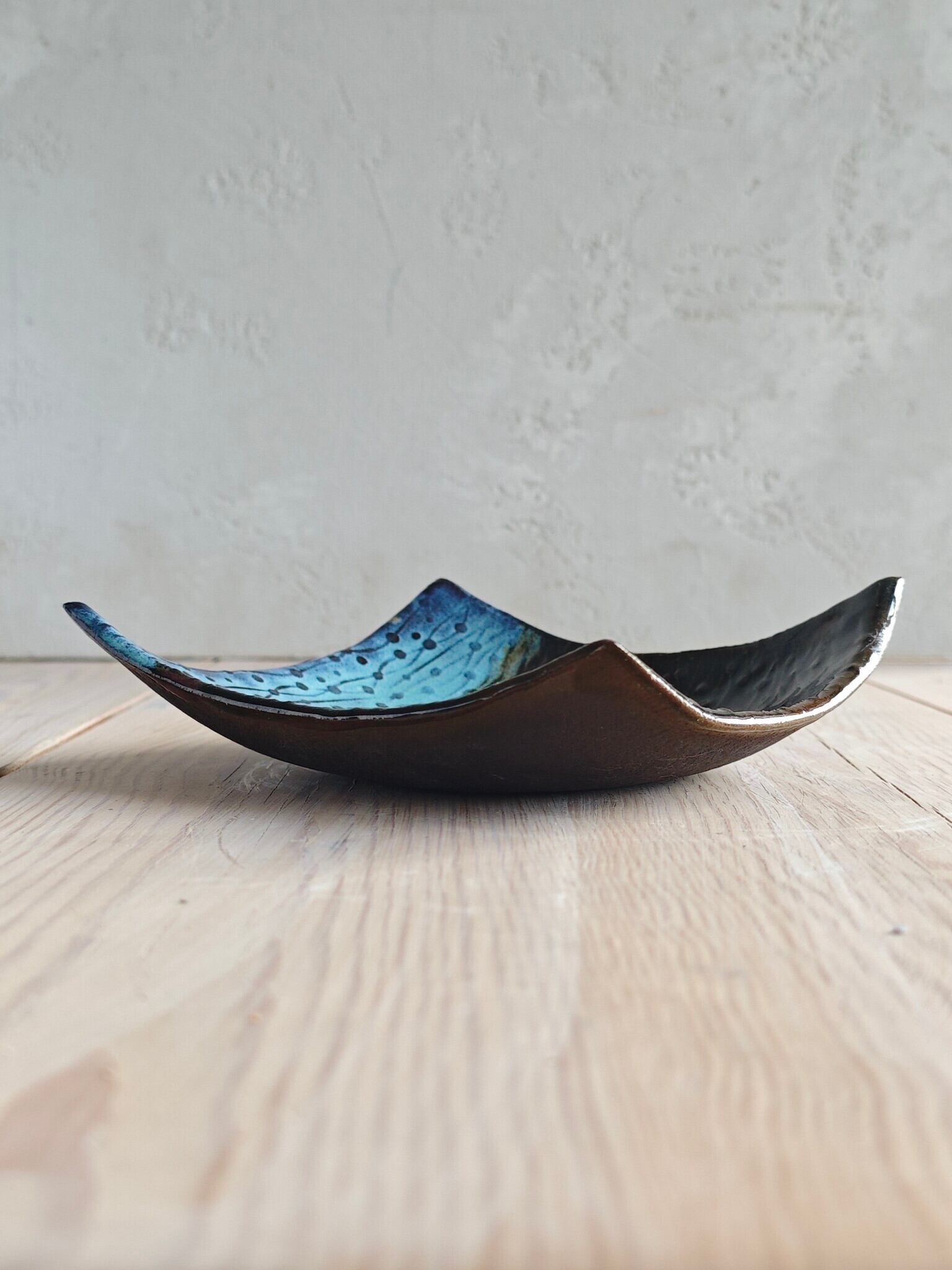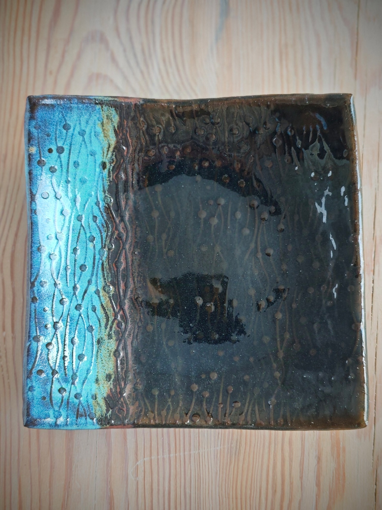 黒織部と水色の美しい組み合わせが特徴の角皿です。お刺身や一品料理などのお料理盛におおススメです。